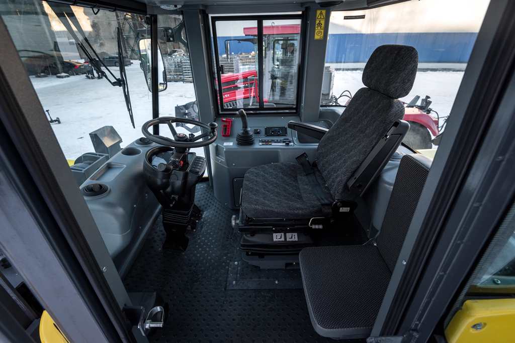 Кабина двухместная, тепло-шумо-изолированная, с регулируемым тепловым режимом, с центральным расположением сиденья водителя, встроенным каркасом безопасности, защищающим оператора от опрокидывании машины (ROPS) и от падающих предметов (FOPS). Удобное расположение органов управления, подрессоренное сиденье водителя, тонированные стекла. Кондиционер устанавливается штатно.